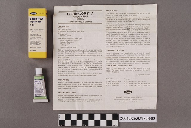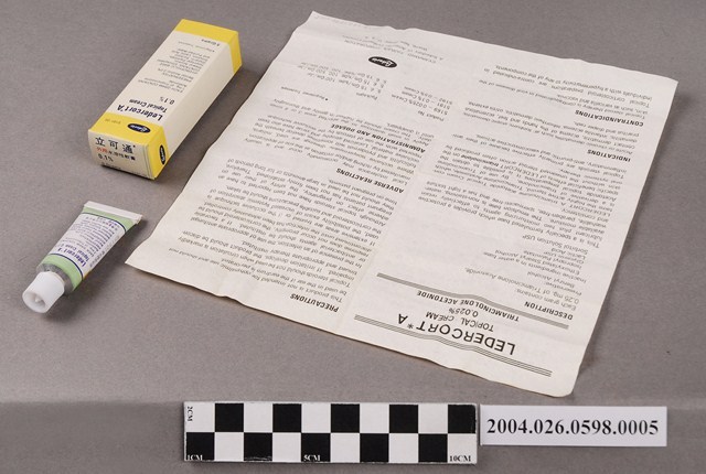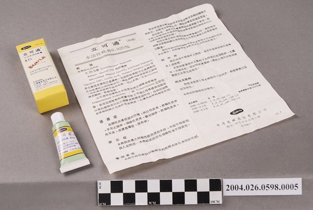 1. 本物件為臺灣氰胺股份有限公司出品立可通外用水溶性軟膏。共有3個物品,分別為包裝紙盒、軟管藥膏、說明書。包裝紙盒為長方體,印有Lederle、立可通外用水溶性軟膏、0.1%、每日塗敷3-4次、5 Grams等字樣。軟管藥膏蓋子為白色,管身印有與包裝紙盒相同字樣,以及英文相對內容。說明書為單張紙,雙面有字,一面為中文,一面為英文。說明書內容有概論、適應症、禁忌症、副作用、用法用量等內容。本藥品可治療異位性皮膚炎、嬰兒濕疹和外耳炎等。