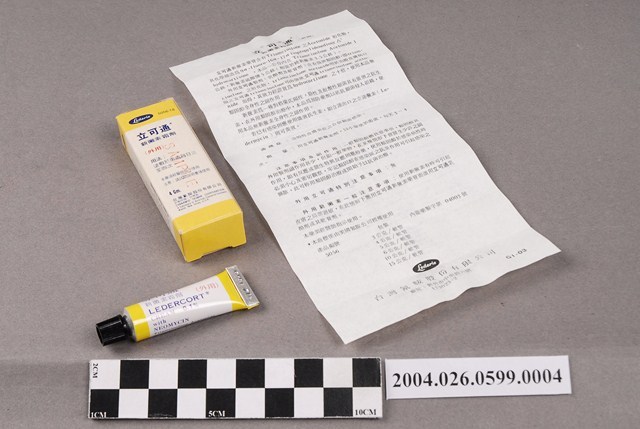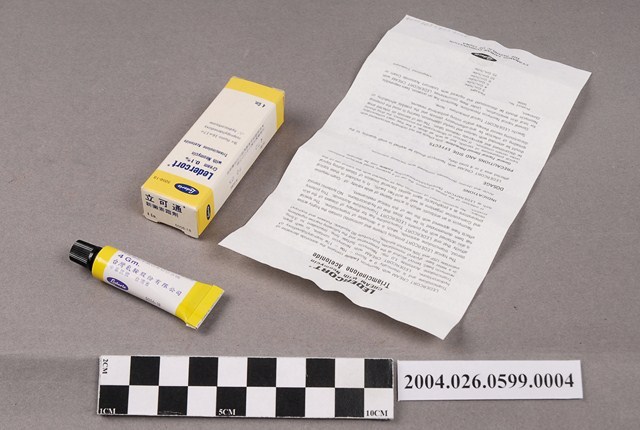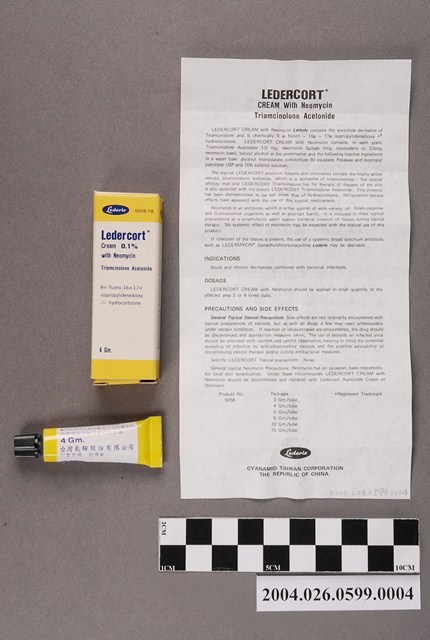 1. 本物件為臺灣氰胺股份有限公司出品立可通新黴素霜劑。共有3個物品,分別為包裝紙盒、軟管霜劑、說明書。包裝紙盒為長方體,印有Lederle、立可通新黴素霜劑、外用、塗敷於患處每日三至四次、4 Grams等字樣,以及英文相對內容。軟管霜劑蓋子為黑色,管身印有與包裝紙盒相同字樣。說明書為單張紙,雙面有字,一面為中文,一面為英文。說明書內容有藥物說明、適應症、劑量、注意事項及副作用等內容。本藥品可治療急、慢性皮膚症之合併細菌感染。