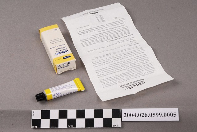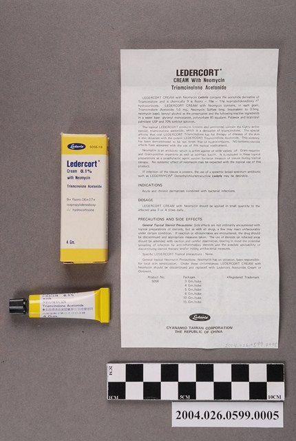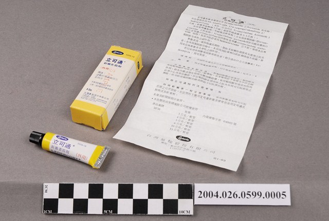 1. 本物件為臺灣氰胺股份有限公司出品立可通新黴素霜劑。共有3個物品,分別為包裝紙盒、軟管霜劑、說明書。包裝紙盒為長方體,印有Lederle、立可通新黴素霜劑、外用、塗敷於患處每日三至四次、4 Grams等字樣,以及英文相對內容。軟管霜劑蓋子為黑色,管身印有與包裝紙盒相同字樣。說明書為單張紙,雙面有字,一面為中文,一面為英文。說明書內容有藥物說明、適應症、劑量、注意事項及副作用等內容。本藥品可治療急、慢性皮膚症之合併細菌感染。