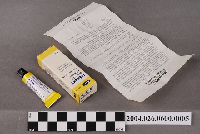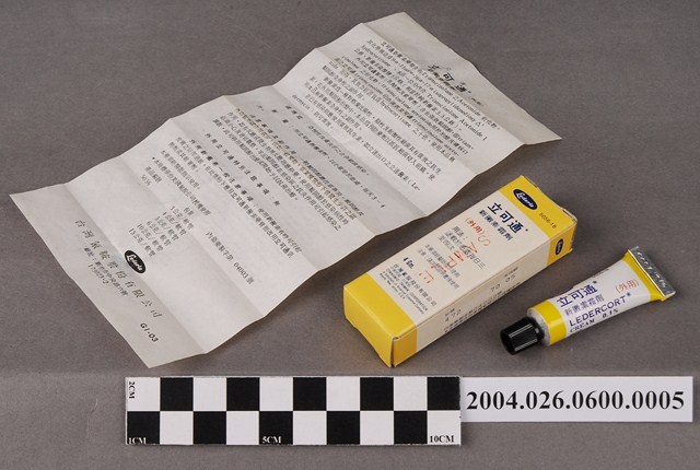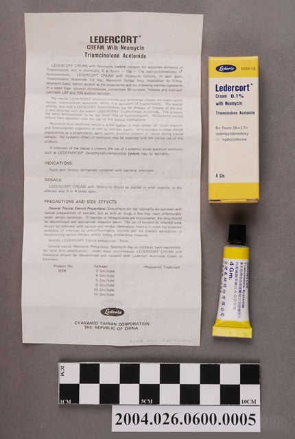 1. 本物件為臺灣氰胺股份有限公司出品立可通新黴素霜劑。共有3個物品,分別為包裝紙盒、軟管霜劑、說明書。包裝紙盒為長方體,印有Lederle、立可通新黴素霜劑、外用、塗敷於患處每日三至四次、4 Grams等字樣,以及英文相對內容。軟管霜劑蓋子為黑色,管身印有與包裝紙盒相同字樣。說明書為單張紙,雙面有字,一面為中文,一面為英文。說明書內容有藥物說明、適應症、劑量、注意事項及副作用等內容。本藥品可治療急、慢性皮膚症之合併細菌感染。