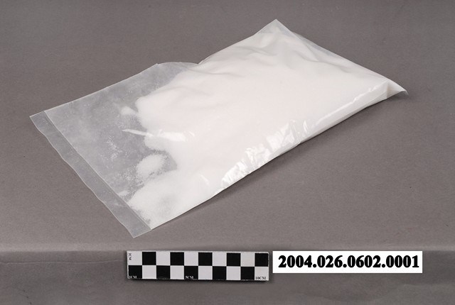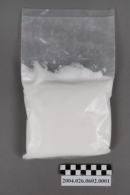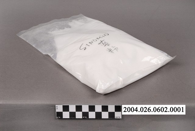 本物件為台灣鹽野義製藥股份有限公司出品止膿敏之藥粉包。藥粉包裝為透明無色塑膠袋,可透視袋子內部物品。袋子上有手寫字體,無圖,有Sinomin藥粉字樣。藥粉為白色。