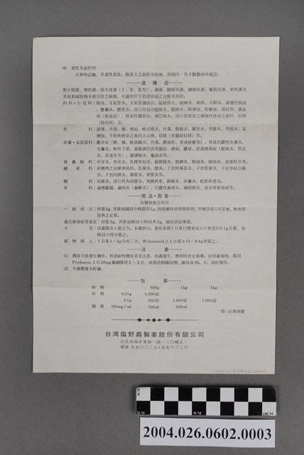 本物件為台灣鹽野義製藥股份有限公司出品止膿敏說明書。說明書為單張紙,雙面有字。止膿敏為新持續性磺胺劑。說明書內容印有藥理作用、適應症、用法用量、注意事項等。適應症例有肺炎、支氣管炎、丹毒和中耳炎等。