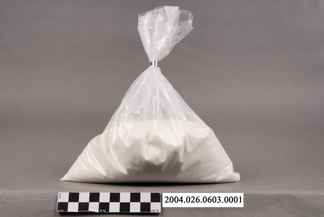 本物件為台灣田邊製藥股份有限公司製造命多磺淨粉劑之藥粉袋。藥粉袋上無字無圖,透明無色,可透視袋子內部物品。袋子以一銀色圈束口。藥粉為白色。