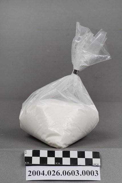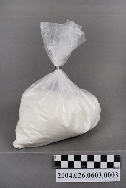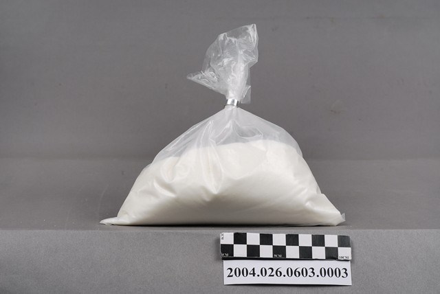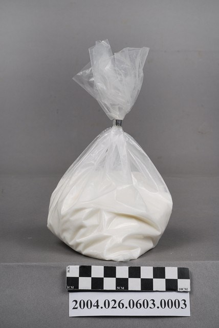 本物件為台灣田邊製藥股份有限公司製造命多磺淨粉劑之藥粉袋。藥粉袋上無字無圖,透明無色,可透視袋子內部物品。袋子以一銀色圈束口。藥粉為白色。