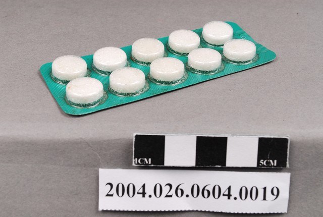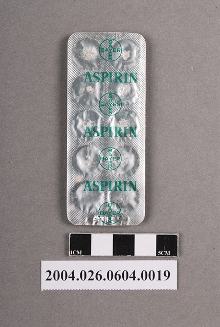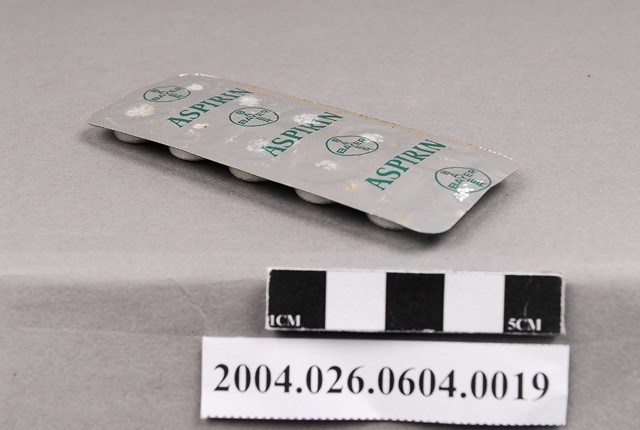 1. 本物件為德國Bayer製ASPIRIN藥排。一排有10顆藥丸。包裝銀色取藥面,印有商標與ASPIRIN字樣,包裝另一面為塑膠容器。藥丸為白色圓型錠狀。 2. 本產品標有衛署藥輸字第013682號,經查衛生福利部食品藥物管理署,其發證日期為西元1985年6月19日,故此產品應為此日期之後所生產。