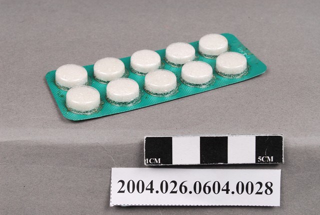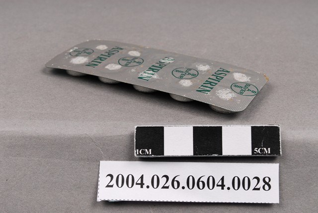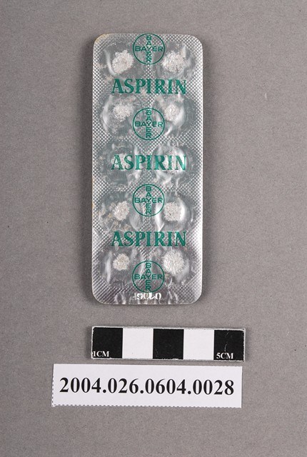 1. 本物件為德國Bayer製ASPIRIN藥排。一排有10顆藥丸。包裝銀色取藥面,印有商標與ASPIRIN字樣,包裝另一面為塑膠容器。藥丸為白色圓型錠狀。 2. 本產品標有衛署藥輸字第013682號,經查衛生福利部食品藥物管理署,其發證日期為西元1985年6月19日,故此產品應為此日期之後所生產。