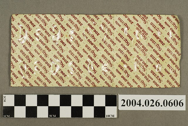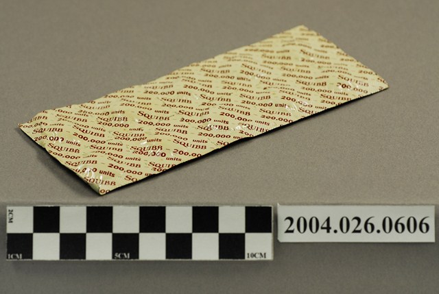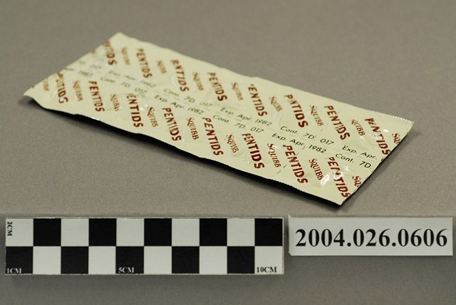 本物件為PENTIDS SQUIBB藥排。此藥排有10顆藥。包裝為不透明,無法視見藥品,有切割線。藥排包裝一面上印有PENTIDS、SQUIBB、Cont. 7D. 017、Exp. Apr. 1982字樣,另一面印有SQUIBB、200,000 units字樣。