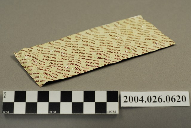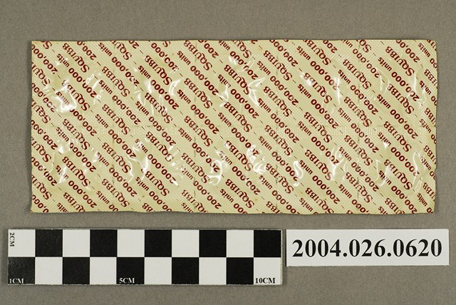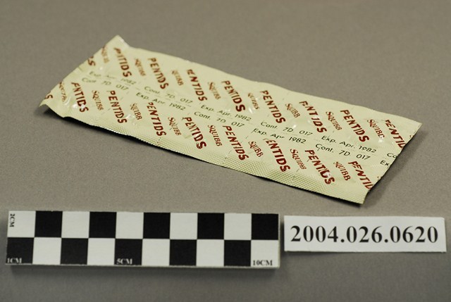 本物件為PENTIDS SQUIBB藥排。此藥排有10顆藥。包裝為不透明,無法視見藥品,有切割線。藥排包裝一面上印有PENTIDS、SQUIBB、Cont. 7D. 017、Exp. Apr. 1982字樣,另一面印有SQUIBB、200,000 units字樣。