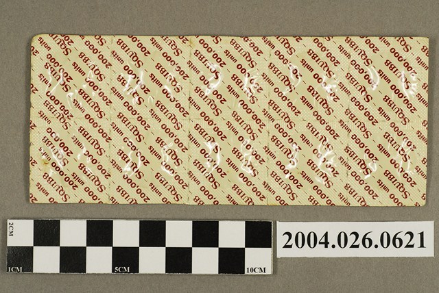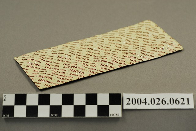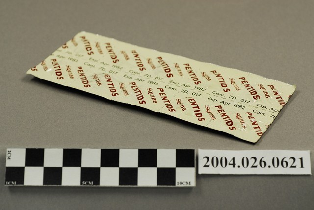 本物件為PENTIDS SQUIBB藥排。此藥排有10顆藥。包裝為不透明,無法視見藥品,有切割線。藥排包裝一面上印有PENTIDS、SQUIBB、Cont. 7D. 017、Exp. Apr. 1982字樣,另一面印有SQUIBB、200,000 units字樣。