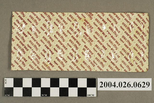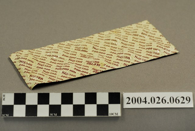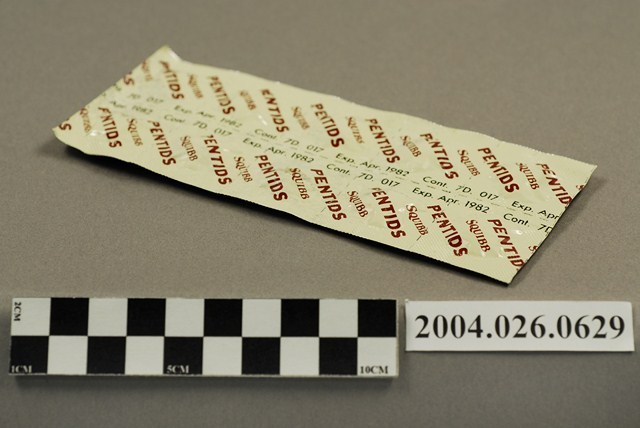 本物件為PENTIDS SQUIBB藥排。此藥排有10顆藥。包裝為不透明,無法視見藥品,有切割線。藥排包裝一面上印有PENTIDS、SQUIBB、Cont. 7D. 017、Exp. Apr. 1982字樣,另一面印有SQUIBB、200,000 units字樣。