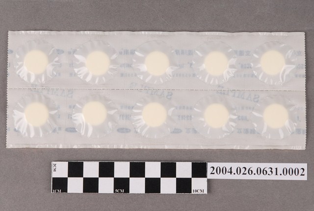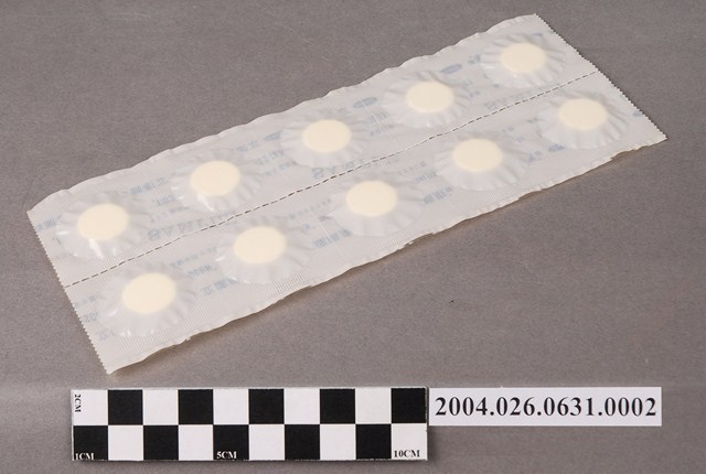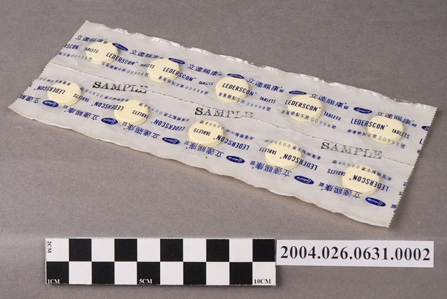 1. 本物件為台灣氰胺股份有限公司出品立達賜康錠之藥排。一排藥有10顆藥片,藥片為圓形。藥排包裝為塑膠膜,其上印有立達賜康錠、LEDERSCON、TABLETS、衛署藥製字第00998號字樣。