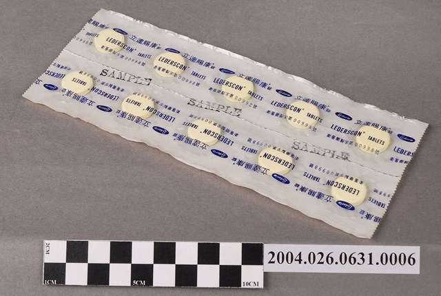 1. 本物件為台灣氰胺股份有限公司出品立達賜康錠之藥排。一排藥有10顆藥片,藥片為圓形。藥排包裝為塑膠膜,其上印有立達賜康錠、LEDERSCON、TABLETS、衛署藥製字第00998號字樣。 2. 本產品標有衛署藥製字第00998號,經查衛生福利部食品藥物管理署,其發證日期為西元1972年5月8日,故此產品應為此日期之後所生產。