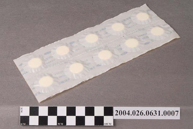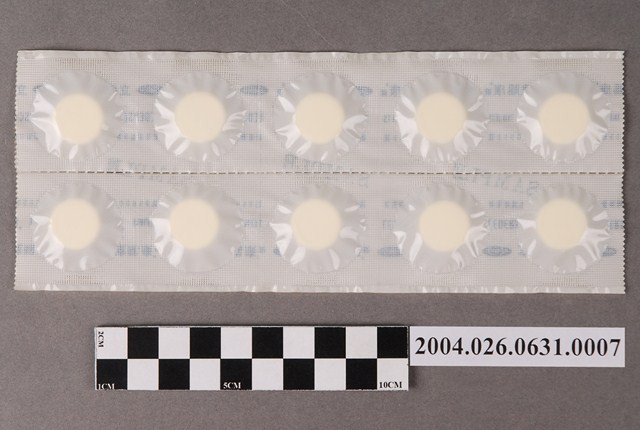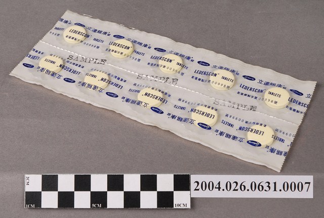 1. 本物件為台灣氰胺股份有限公司出品立達賜康錠之藥排。一排藥有10顆藥片,藥片為圓形。藥排包裝為塑膠膜,其上印有立達賜康錠、LEDERSCON、TABLETS、衛署藥製字第00998號字樣。