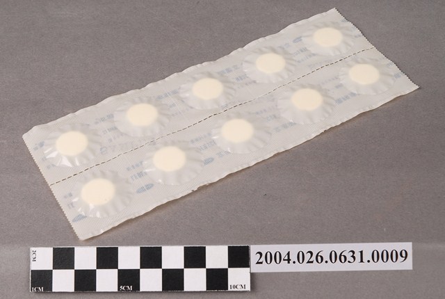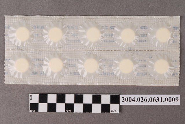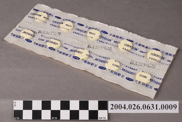 1. 本物件為台灣氰胺股份有限公司出品立達賜康錠之藥排。一排藥有10顆藥片,藥片為圓形。藥排包裝為塑膠膜,其上印有立達賜康錠、LEDERSCON、TABLETS、衛署藥製字第00998號字樣。
