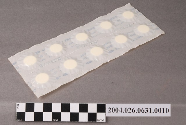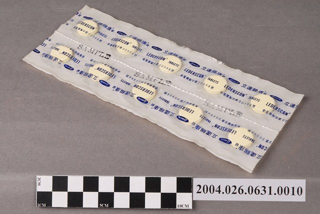1. 本物件為台灣氰胺股份有限公司出品立達賜康錠之藥排。一排藥有10顆藥片,藥片為圓形。藥排包裝為塑膠膜,其上印有立達賜康錠、LEDERSCON、TABLETS、衛署藥製字第00998號字樣。 2. 本產品標有衛署藥製字第00998號,經查衛生福利部食品藥物管理署,其發證日期為西元1972年5月8日,故此產品應為此日期之後所生產。