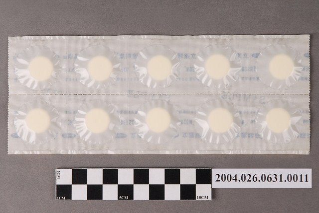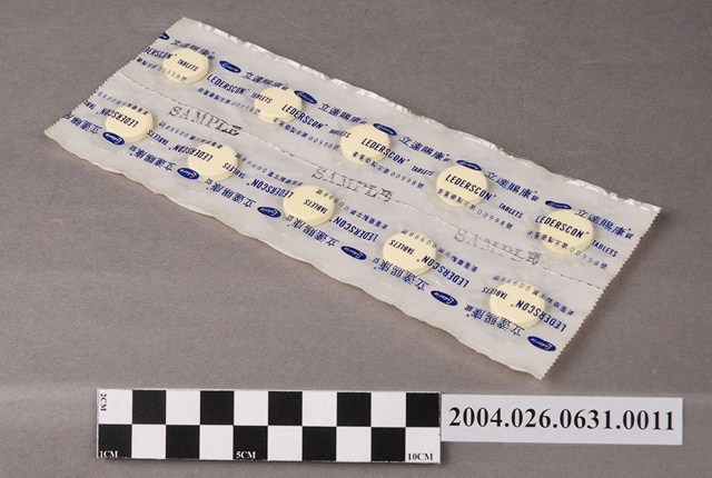 1. 本物件為台灣氰胺股份有限公司出品立達賜康錠之藥排。一排藥有10顆藥片,藥片為圓形。藥排包裝為塑膠膜,其上印有立達賜康錠、LEDERSCON、TABLETS、衛署藥製字第00998號字樣。