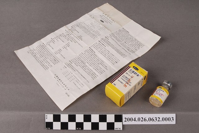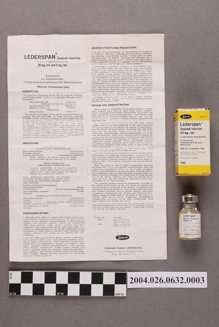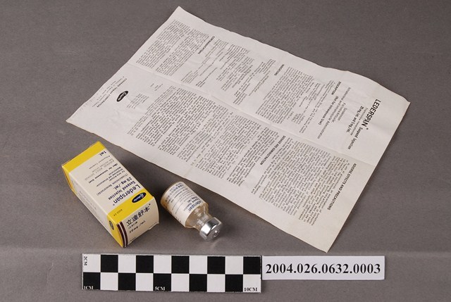 1. 本物件為臺灣氰胺股份有限公司出品立達舒本注射液。共有3個物品,分別為包裝紙盒、藥瓶和說明書。包裝紙盒一面印有立達舒本注射液、20公絲、Sample等字樣,另一面為英文之相對應內容。藥瓶瓶身為透明無色,瓶蓋為金屬製,瓶身貼有標籤。說明書為單張紙,雙面有字,一面為中文,一面為英文。中文內容包括藥品說明和適應症等。此藥品可治療關節炎。