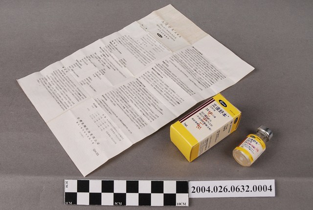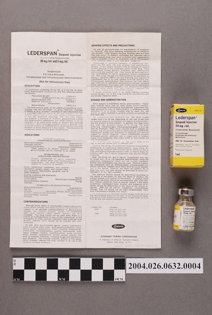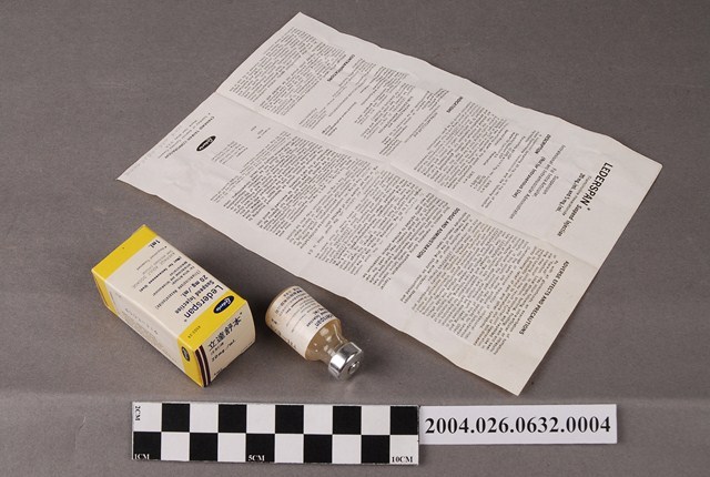 1. 本物件為臺灣氰胺股份有限公司出品立達舒本注射液。共有3個物品,分別為包裝紙盒、藥瓶和說明書。包裝紙盒一面印有立達舒本注射液、20公絲、Sample等字樣,另一面為英文之相對應內容。藥瓶瓶身為透明無色,瓶蓋為金屬製,瓶身貼有標籤。說明書為單張紙,雙面有字,一面為中文,一面為英文。中文內容包括藥品說明和適應症等。此藥品可治療關節炎。