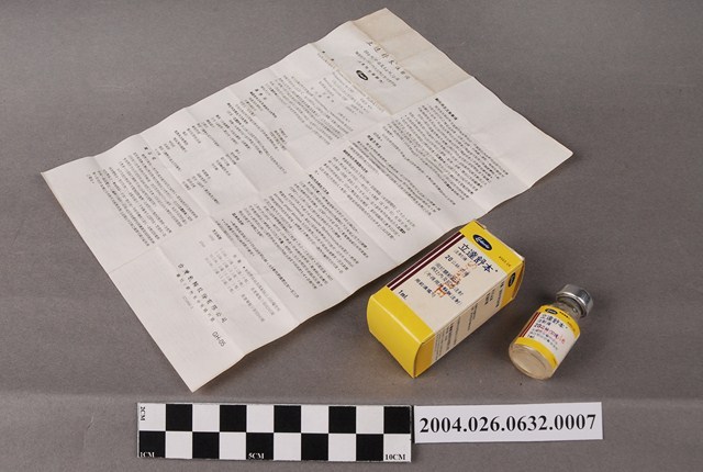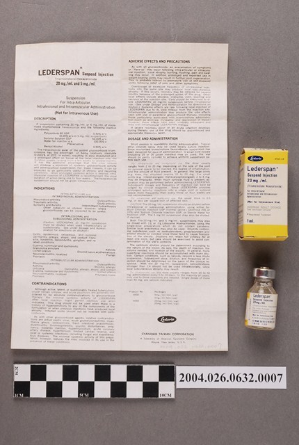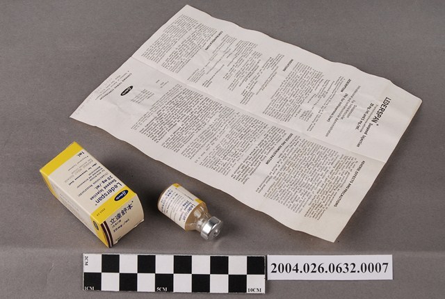1. 本物件為臺灣氰胺股份有限公司出品立達舒本注射液。共有3個物品,分別為包裝紙盒、藥瓶和說明書。包裝紙盒一面印有立達舒本注射液、20公絲、Sample等字樣,另一面為英文之相對應內容。藥瓶瓶身為透明無色,瓶蓋為金屬製,瓶身貼有標籤。說明書為單張紙,雙面有字,一面為中文,一面為英文。中文內容包括藥品說明和適應症等。此藥品可治療關節炎。