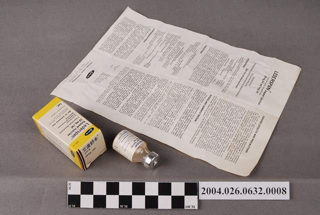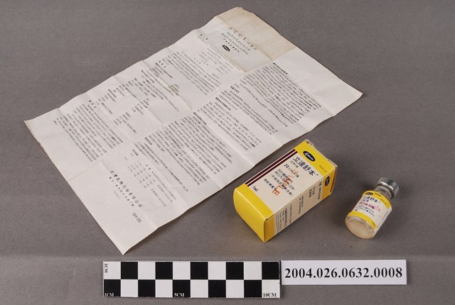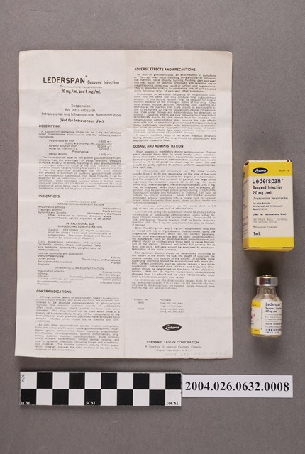 1. 本物件為臺灣氰胺股份有限公司出品立達舒本注射液。共有3個物品,分別為包裝紙盒、藥瓶和說明書。包裝紙盒一面印有立達舒本注射液、20公絲、Sample等字樣,另一面為英文之相對應內容。藥瓶瓶身為透明無色,瓶蓋為金屬製,瓶身貼有標籤。說明書為單張紙,雙面有字,一面為中文,一面為英文。中文內容包括藥品說明和適應症等。此藥品可治療關節炎。