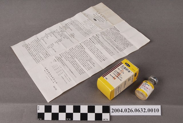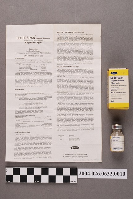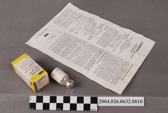1. 本物件為臺灣氰胺股份有限公司出品立達舒本注射液。共有3個物品,分別為包裝紙盒、藥瓶和說明書。包裝紙盒一面印有立達舒本注射液、20公絲、Sample等字樣,另一面為英文之相對應內容。藥瓶瓶身為透明無色,瓶蓋為金屬製,瓶身貼有標籤。說明書為單張紙,雙面有字,一面為中文,一面為英文。中文內容包括藥品說明和適應症等。此藥品可治療關節炎。
