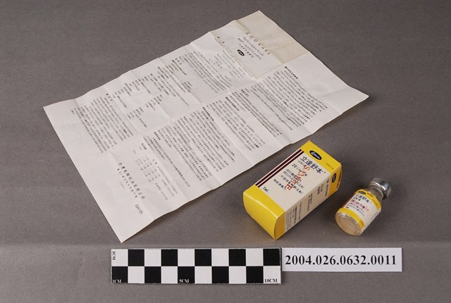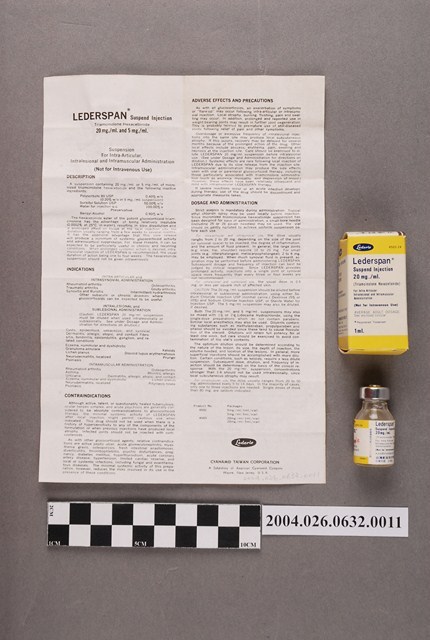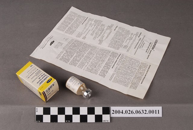 1. 本物件為臺灣氰胺股份有限公司出品立達舒本注射液。共有3個物品,分別為包裝紙盒、藥瓶和說明書。包裝紙盒一面印有立達舒本注射液、20公絲、Sample等字樣,另一面為英文之相對應內容。藥瓶瓶身為透明無色,瓶蓋為金屬製,瓶身貼有標籤。說明書為單張紙,雙面有字,一面為中文,一面為英文。中文內容包括藥品說明和適應症等。此藥品可治療關節炎。