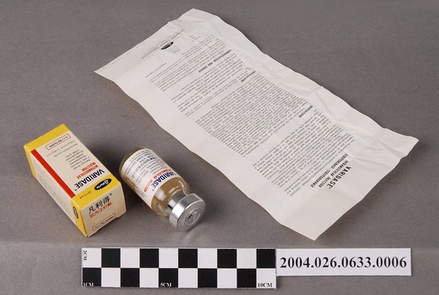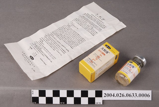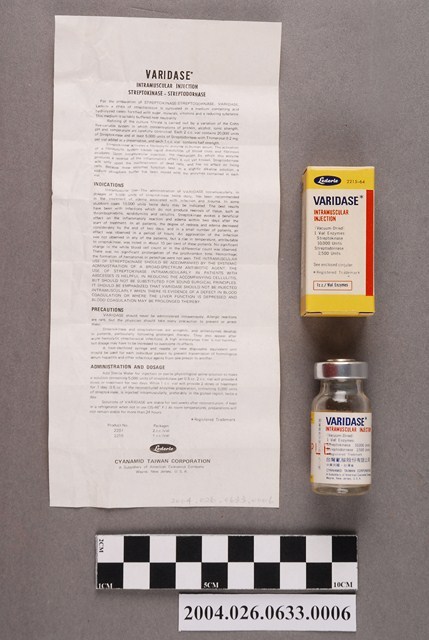1. 本物件為臺灣氰胺股份有限公司出品凡利得肌肉注射劑。共有3個物品,分別為包裝紙盒、藥瓶和說明書。包裝紙盒一面印有凡利得肌肉注射劑、Sample等字樣,另一面為英文之相對應內容。藥瓶瓶身為透明無色,瓶蓋為金屬製,瓶身貼有標籤。說明書為單張紙,雙面有字,一面為中文,一面為英文。中文內容包括藥品說明和適應症等。此藥品可治療由於外傷或感染所致之浮腫。