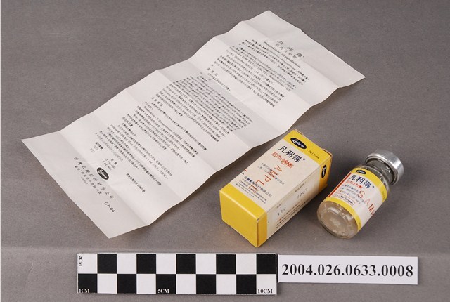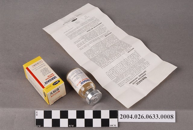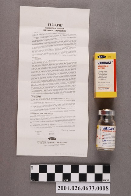 1. 本物件為臺灣氰胺股份有限公司出品凡利得肌肉注射劑。共有3個物品,分別為包裝紙盒、藥瓶和說明書。包裝紙盒一面印有凡利得肌肉注射劑、Sample等字樣,另一面為英文之相對應內容。藥瓶瓶身為透明無色,瓶蓋為金屬製,瓶身貼有標籤。說明書為單張紙,雙面有字,一面為中文,一面為英文。中文內容包括藥品說明和適應症等。此藥品可治療由於外傷或感染所致之浮腫。