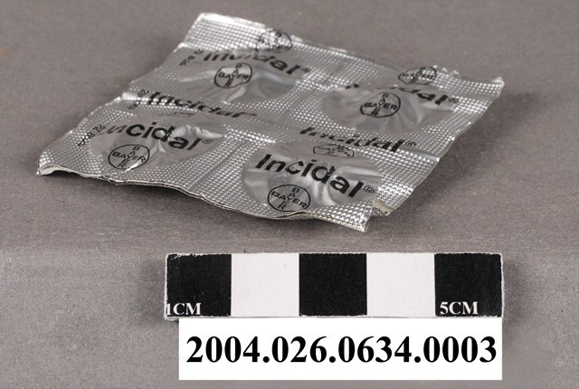 1. 本物件為德國Bayer製益舒達錠藥排。一排藥有4顆藥錠,外包裝為銀色,看不到藥錠顏色,包裝上印有商標和Incidal字樣等。 2. 本產品標有衛署藥輸字第014414號,經查衛生福利部食品藥物管理署,此藥適應症為過敏性鼻炎、呼吸道過敏、過敏性疾患,其發證日期為西元1985年10月17日,故此產品應為此日期之後所生產。