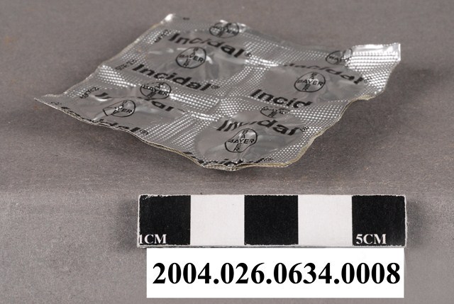 1. 本物件為德國Bayer製益舒達錠藥排。一排藥有4顆藥錠,外包裝為銀色,看不到藥錠顏色,包裝上印有商標和Incidal字樣等。