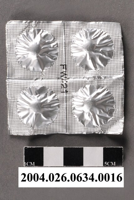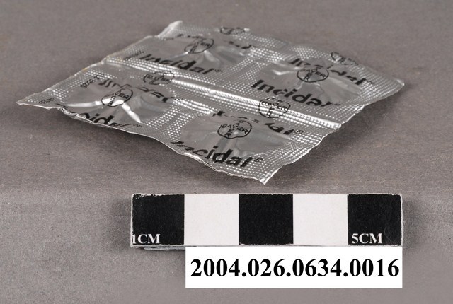 1. 本物件為德國Bayer製益舒達錠藥排。一排藥有4顆藥錠,外包裝為銀色,看不到藥錠顏色,包裝上印有商標和Incidal字樣等。