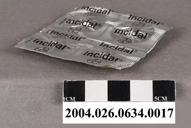 1. 本物件為德國Bayer製益舒達錠藥排。一排藥有4顆藥錠,外包裝為銀色,看不到藥錠顏色,包裝上印有商標和Incidal字樣等。