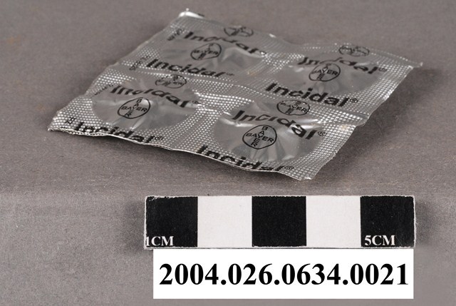 1. 本物件為德國Bayer製益舒達錠藥排。一排藥有4顆藥錠,外包裝為銀色,看不到藥錠顏色,包裝上印有商標和Incidal字樣等。