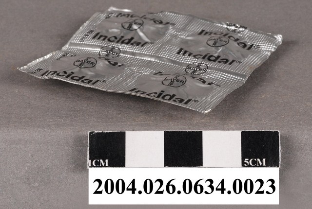 1. 本物件為德國Bayer製益舒達錠藥排。一排藥有4顆藥錠,外包裝為銀色,看不到藥錠顏色,包裝上印有商標和Incidal字樣等。