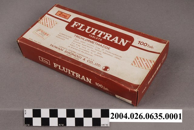 1. 台灣鹽野義製藥股份有限公司出品服爾伊得安錠包裝紙盒。紙盒封面印有服爾伊得安錠、TRICHLORMETHIAZIDE錠、100錠等字樣,以及成分、用法用量和適應症內容,可當作降壓劑和利尿劑使用。 2. 本產品標有內衛藥製字第04446號,經查衛生福利部食品藥物管理署,其發證日期為西元1970年6月11日,故此產品應為此日期之後所生產。 3. 西元1878年鹽野義三郎在大阪中央區道修町開店創業,販賣經銷日本與漢方藥品,西元1923年該公司決定在臺灣銷售藥品,西元1963年創設臺灣分公司。