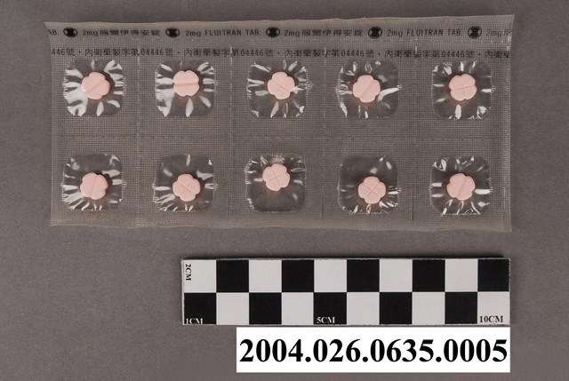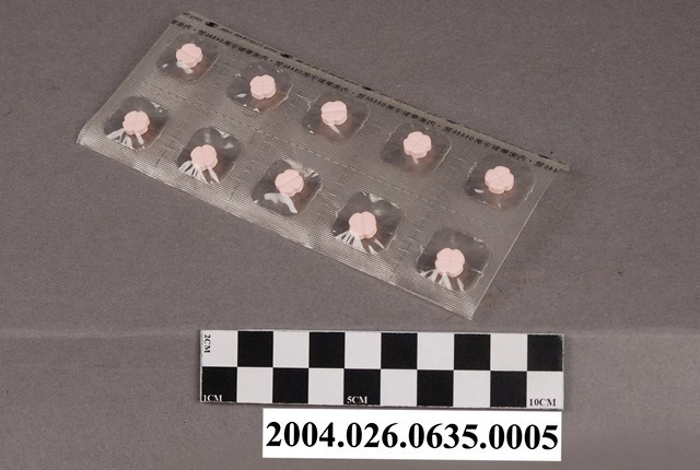 1. 台灣鹽野義製藥股份有限公司出品服爾伊得安錠藥排。一排藥有10顆藥錠,藥錠為粉紅色圓形。外包裝是透明,從外可看見藥錠,包裝上印有內衛藥製字第04446號、2mg、服爾伊得安錠字樣。 2. 本產品標有內衛藥製字第04446號,經查衛生福利部食品藥物管理署,其發證日期為西元1970年6月11日,故此產品應為此日期之後所生產。 3. 西元1878年鹽野義三郎在大阪中央區道修町開店創業,販賣經銷日本與漢方藥品,西元1923年該公司決定在臺灣銷售藥品,西元1963年創設臺灣分公司。