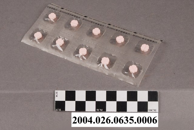 1. 台灣鹽野義製藥股份有限公司出品服爾伊得安錠藥排。一排藥有10顆藥錠,藥錠為粉紅色圓形。外包裝是透明,從外可看見藥錠,包裝上印有內衛藥製字第04446號、2mg、服爾伊得安錠字樣。 2. 本產品標有內衛藥製字第04446號,經查衛生福利部食品藥物管理署,其發證日期為西元1970年6月11日,故此產品應為此日期之後所生產。 3. 西元1878年鹽野義三郎在大阪中央區道修町開店創業,販賣經銷日本與漢方藥品,西元1923年該公司決定在臺灣銷售藥品,西元1963年創設臺灣分公司。