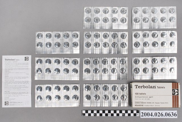 本物件為台灣德國藥品股份有限公司製造抗高血壓劑脫博難錠。共有3種物品,分別為包裝紙盒、藥排和說明書。
