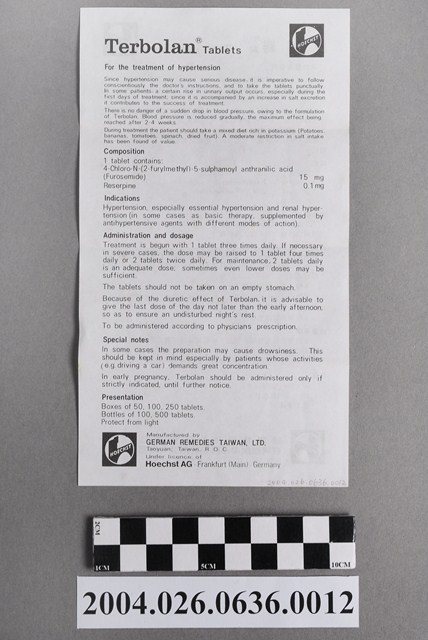 本物件為台灣德國藥品股份有限公司製造抗高血壓劑脫博難錠說明書。說明書為單張紙,雙面有字,一面為中文,一面為英文。中文面印有成分、適應症、用法用量、注意事項等內容,此藥可治療高血壓,服用時偶而會引起昏睡。