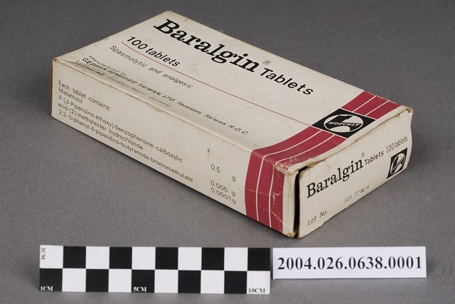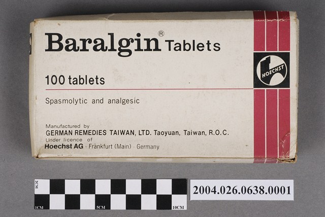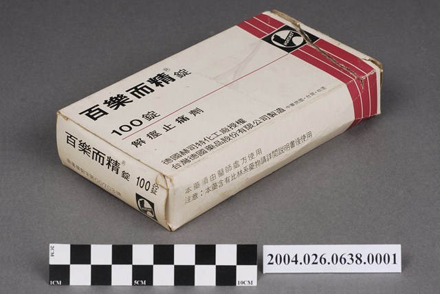 1. 本物件為台灣德國藥品股份有限公司製造解痙止痛劑百樂而精錠包裝紙盒。紙盒封面印有百樂而精錠、解痙止痛劑、100錠等字樣,以及製藥廠資訊。另一面則是有相對應的英文內容。側面印有成分說明和衛署藥製字第00703號。 2. 本產品標有衛署藥製字第00703號,應為西元1971-2013年許可字號的產物,但在衛生福利部食品藥物管理署查無此字號之產品。