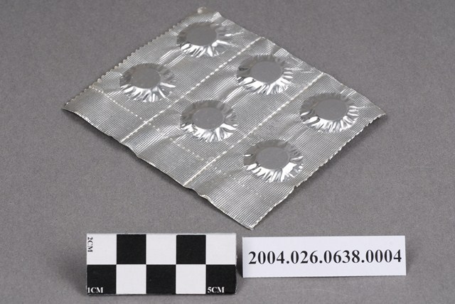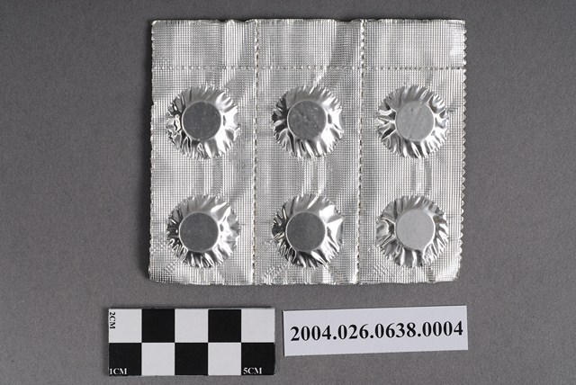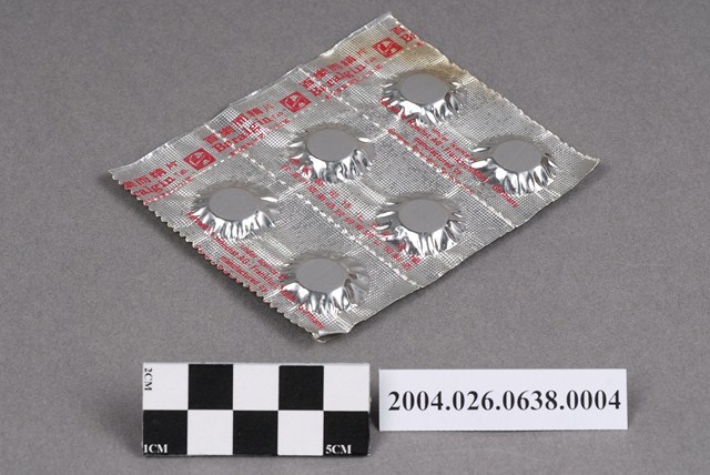 1. 本物件為台灣德國藥品股份有限公司製造解痙止痛劑百樂而精錠藥排。一排藥有6顆藥錠。外包裝為銀色不透明材質,從包裝外無法見藥片顏色。外包裝上有一面印有紅色字體,可辨識之文字為百樂而精片和Baralgin Tab,另一面則沒有文字。 2. 本產品標有衛署藥製字第00703號,應為西元1971-2013年許可字號的產物,但在衛生福利部食品藥物管理署查無此字號之產品。