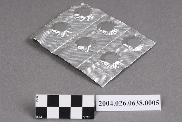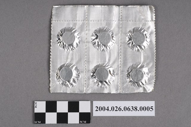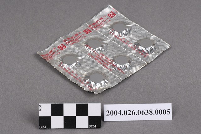 1. 本物件為台灣德國藥品股份有限公司製造解痙止痛劑百樂而精錠藥排。一排藥有6顆藥錠。外包裝為銀色不透明材質,從包裝外無法見藥片顏色。外包裝上有一面印有紅色字體,可辨識之文字為百樂而精片和Baralgin Tab,另一面則沒有文字。