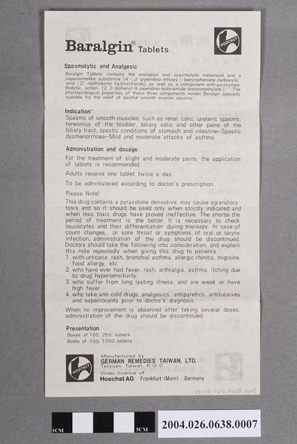 1. 本物件為台灣德國藥品股份有限公司製造解痙止痛劑百樂而精錠說明書。說明書為單張紙雙面有字。一面印有藥品說明、適應症、用法用量和注意事項等內容,適應症有平滑肌痙攣、腎絞痛、輸尿管痙攣、經痛等。另一面則是英文說明。 2. 本產品標有衛署藥製字第00703號,應為西元1971-2013年許可字號的產物,但在衛生福利部食品藥物管理署查無此字號之產品。