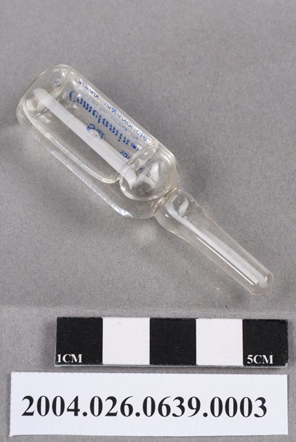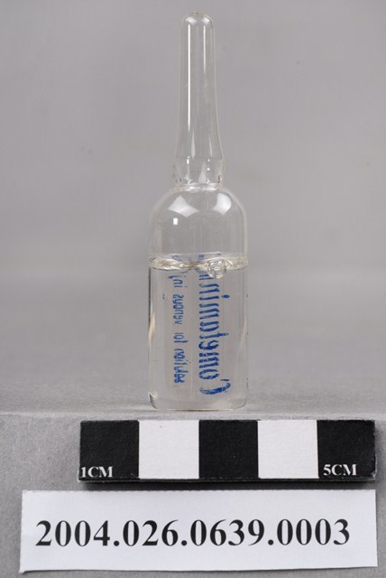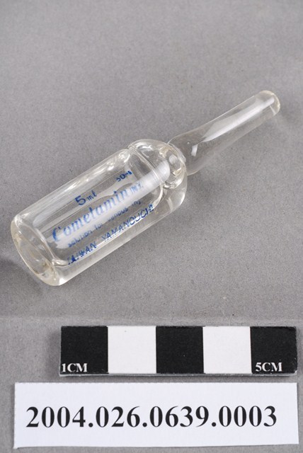 1. 本物件為台灣山之內製藥股份有限公司出品康美多明注射液之溶解液。藥瓶為一體成形,透明無色,瓶上印有藍色字體,有5ml、Cometamin、solution for venous inj.、TAIWAN YAMANOUCHI字樣。瓶內有透明無色液體。 2. 本產品標有內衛藥製字第15376號,經查衛生福利部食品藥物管理署,其發證日期為西元1970年12月2日,故此產品應為此日期之後所生產。