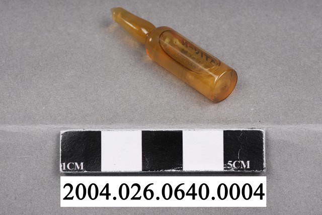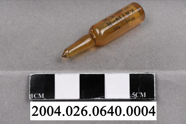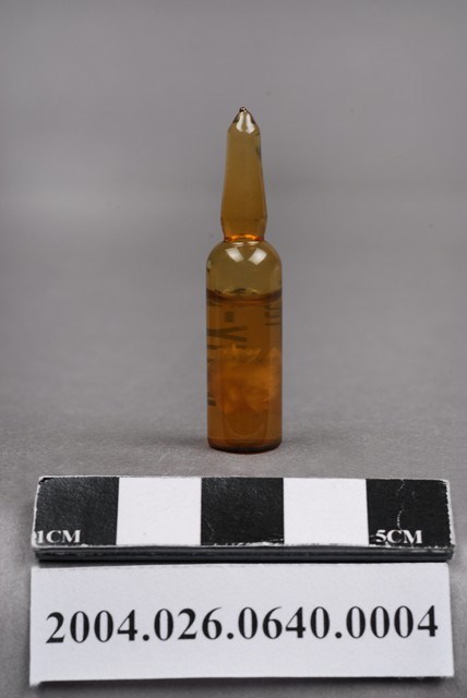 1.本物件為台灣武田藥品工業股份有限公司出品加體膚N注射液之藥瓶。藥瓶為一體成形,透明茶色。瓶身印有KATIV-N、Vitamin K1、10mg、1cc等字樣。 2.本產品標有衛藥字第11889號,應為二戰後產品,在衛生福利部食品藥物管理署查無此字號之產品。 3.武田製藥總公司,創立者為武田長兵衛,於西元1781年在日本東京成立。台灣武田藥品工業股份有限公司則於1962年創立於臺北,為日本武田藥品工業株式會社之海外投資機構之一。