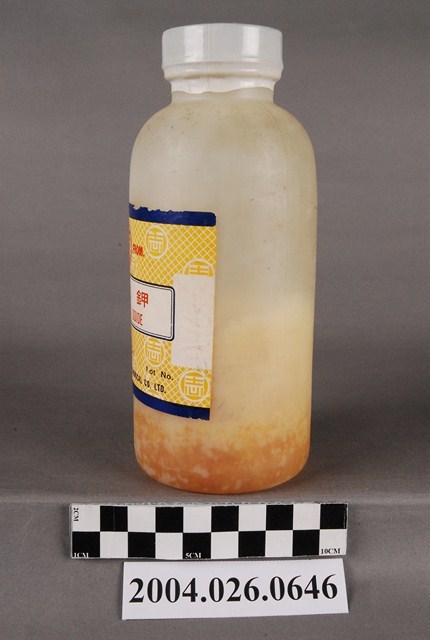 本物件為碘化鉀。包裝為半透明白色塑膠瓶,瓶蓋上有封膜,瓶內有化學物質。瓶身貼有一標籤,標籤上印有商標和碘化鉀、POTASSIUM IODIDE、Net 450 Gm、志等字樣。