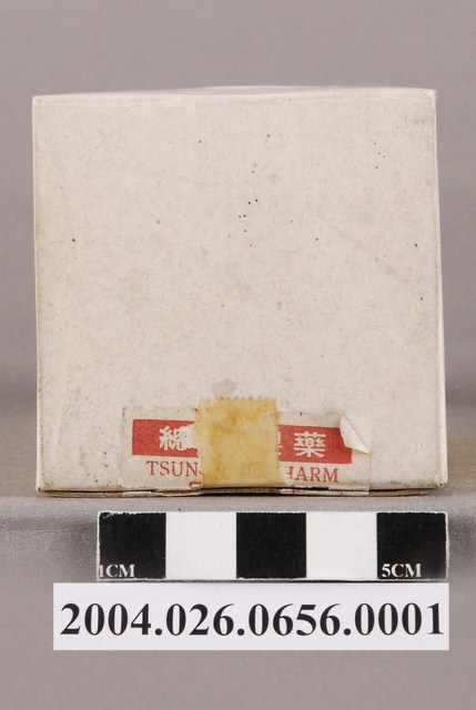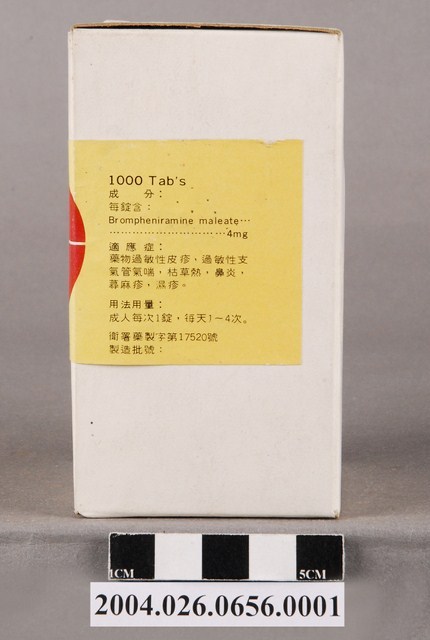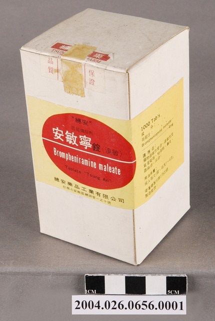 1.本物件為安敏寧錠之包裝紙盒。紙盒為白底長方體。盒蓋開啟處與盒身交接處貼有一封條標籤,有品質保證等字樣。盒身正面延伸至側面貼有一品名標籤,標籤為黃底。盒身正面部分的標籤有一紅色橢圓型圖案,其上有總安、抗組織胺劑、安敏寧錠(溴敏)、Bromphenir amine maleate等字樣,橢圓圖案下方有總安藥品工業有限公司、台南市安南區總頭里一之十號等字樣。盒身側面部分的標籤有1000 Tab's、成分、適應症、用法用量、衛署藥製字第17520號與製造批號等字樣和說明。
