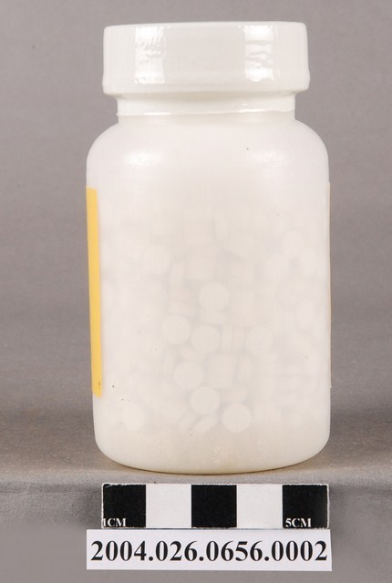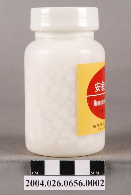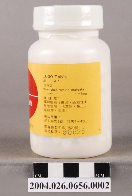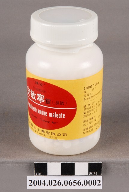 1.本物件為安敏寧錠之藥瓶。瓶身為白色圓身,有一白色蓋子,瓶身與瓶蓋似塑膠材質。瓶身有一品名標籤,如分左右兩部分,標籤左半部有一紅色橢圓型圖案,其上有總安、抗組織胺劑、安敏寧錠(溴敏)、Bromphenir amine maleate等字樣,橢圓圖案下方有總安藥品工業有限公司、台南市安南區總頭里一之十號等字樣。標籤右半部有1000 Tab's、成分、適應症、用法用量、衛署藥製字第17520號與製造批號等字樣和說明。