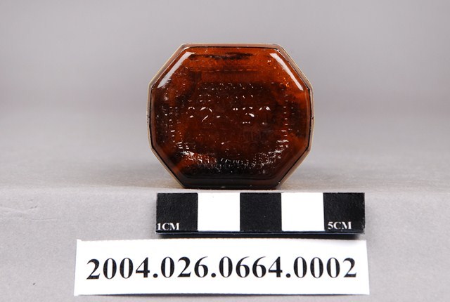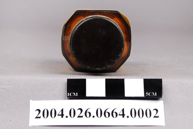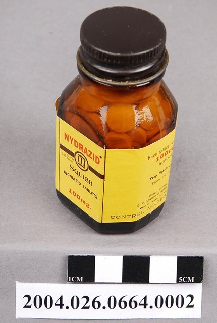 1.本物件為癆得治片之藥瓶。瓶身為茶色透明八角型體,似玻璃材質,有一深茶色蓋子,似金屬材質。瓶身有一品名標籤,黃底印有紅色、茶色字體以及一商標。標籤上印有NYDRAZID、SQUIBB、ISONIAZID TABLET、100mg、癆得治片、100公絲、成分、用法用量,製造公司、製造地和衛署藥製字第00023號等字樣與說明。