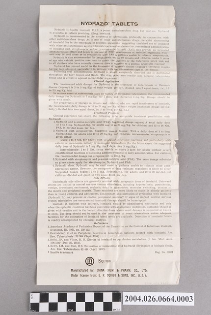 2.根據衛生福利部食品藥物管理署藥物許可證登記所示,此藥適應症:結核病。必治妥(Bristol-Myers)與施貴寶(Squibb)於西元1989年合併,因此此藥在此之前生產,另,衛署藥製字第00023號,應為西元1971-2013年許可字號的產物。